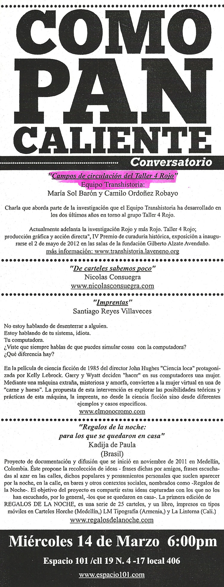 AVISO charla de socialización "Campos de circulación del Taller 4 Rojo" en "Como Pan Caliente" (14/05/2012)